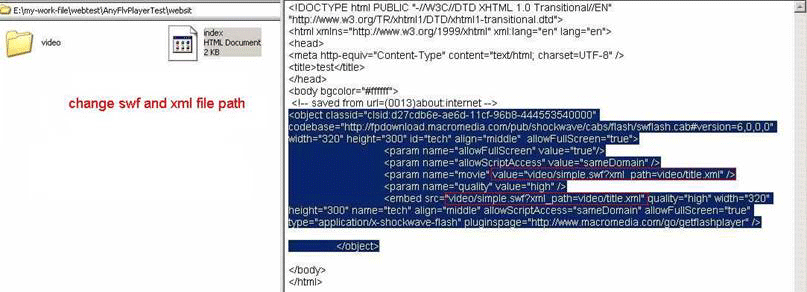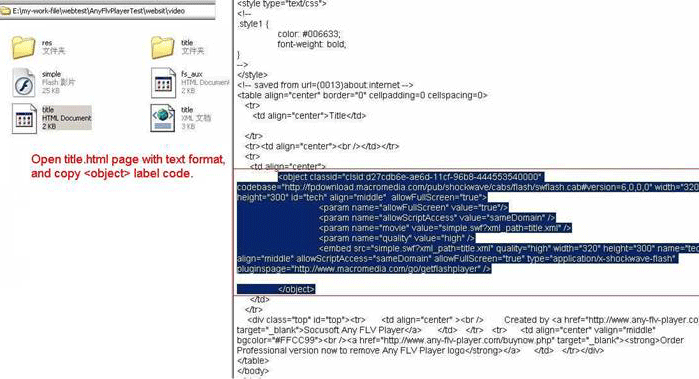 - Open 'title.html' page with the text tool and copy the code of the <object> label as shown below: